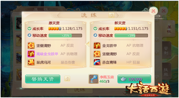 玩家除了可以通过“坐骑驯养”提升坐骑等级,还可以利用 “坐骑洗练”来改变坐骑的成长率、移动速度和坐骑技能。每个坐骑对应一个独立的技能库,坐骑洗练时会重置技能,并根据不同概率随机洗练出技能库里的技能。同时,玩家也可通过使用“筋骨提气丹”来提高坐骑成长率。坐骑技能熟练度可以通过使用“丹书秘卷”和少量师贡,或者参加明雷战斗的方式提升。
