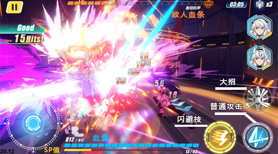 如上图所示小编操作琪亚娜后空翻秀了小怪兽一脸,并且因为是在出手的一瞬间躲掉攻击成功触发了时空断裂状态。如果你有不错的操作和反应,完全可以让怪摸都摸不到你一下。同时每次攻击都会储存一定的SP值,存满后就可以释放大招了。