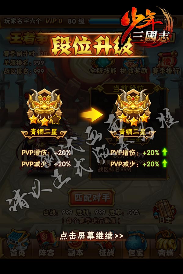 在大神云集的赛场,体验高手间一对一的强强对抗;在万众瞩目中登顶王者宝座,享受胜者为王的无上荣耀!你是不是已经准备好要迎接更高水平的挑战了?《少年三国志》迎来最强PVP版本——王者争霸资料片,首届三国排位赛即将开战,证明自己,成就荣耀!