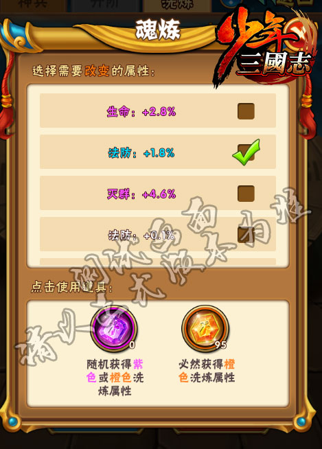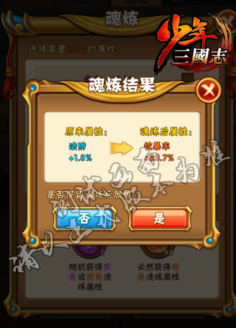 在《少年三国志》王者争霸资料片中,神器“高级神兵魂石”横空出世,助阵少年成就王者之路!三国神兵觉醒后,英明的少年对于属性的要求那是相当的严苛,古人云,“工欲善其事必先利其器”,有了神兵当然要将其培养成秒杀一方的大杀器!现在,高级神兵魂石前来助力,洗炼必出橙色属性,神兵战力一飞冲天!