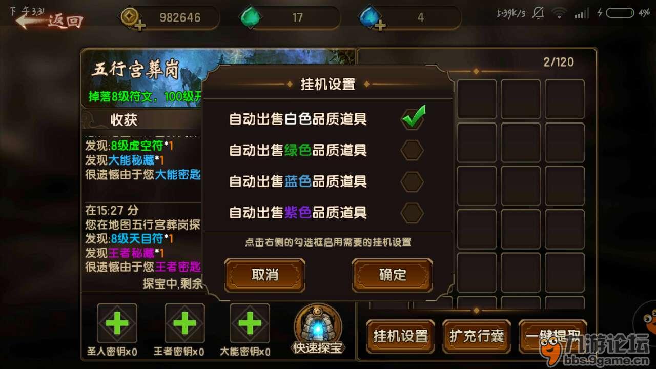 建议将符文行囊扩充满,也就是120个,五分钟就可以获取一个符文,十个小时就可以满了。当然了,在线的时候可以把所有的符文留下,下线前收一次,然后进行熔炼。之后就在挂机设置哪里设置不要的符文,然后你就可以下线了。