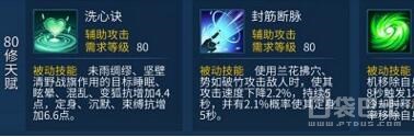 80天赋,洗心诀,让旗子给大家而外提供抗性buff,还蛮好用的在团战的时候,封筋断脉,附带定身效果,抓远程职业还不错了啦,不药而愈,吐纳移除debuff 心魔呀,毒呀…都是可以解掉的。