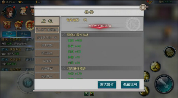 值得注意的是游戏中不同称号根据获取难度大小,分绿、蓝、紫、金、红5种不同的品质,红色为最高品质。称号品质越高属性加成越高,从而越能够大幅提高战力。每一个称号的可增益的基础属性有三种,分别是生命、攻击和防御,玩家可以通过佩戴不同称号增加生命力、攻击力或是防御力。此外,相同品质的统一称号在属性加成上也大有乾坤,除了可以直接生效的基础属性,每个称号还有额外增益属性需要手动激活,额外增益属性包括命中、闪避、暴击、抗暴等几种,解锁称号后玩家可以根据自身侠客的战斗定位需要将称号增益调整至最佳状态。总而言之,称号搭配千万种,异彩纷呈的江湖称号之旅正等你开启!