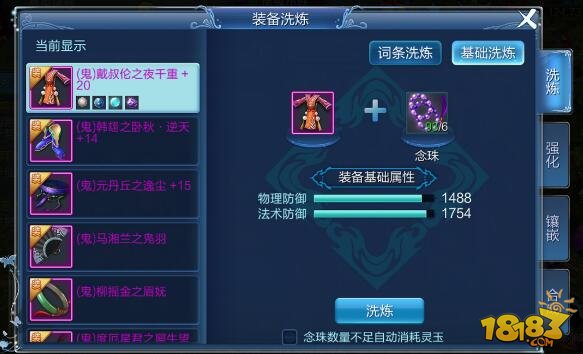 基础洗炼需要消耗念珠,消耗个数根据装备颜色和等级而不同。