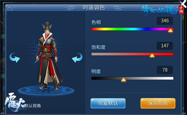 然而这款时装的匠心不止于对明代服饰的还原与演绎,这是第一款可以由玩家自定义颜色的时装。可不止是提供多种颜色供选择,而是玩家可以通过调色界面,修改色相、饱和度、明度三个指标,创建只属于自己的独一无法的时装!