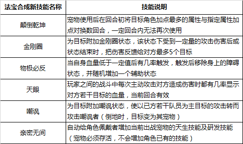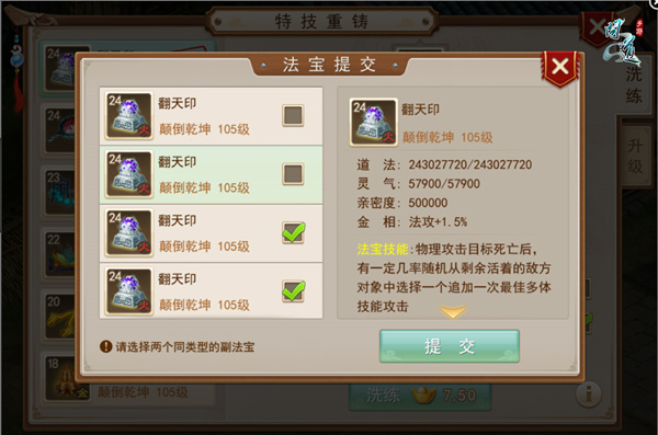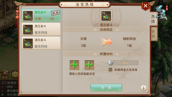 仅7级以上法宝可作为主法宝洗炼,洗炼时需要消耗2个同类的副法宝及466银元宝/金元宝。作为同类的副法宝仅有类型限制,无等级要求。洗炼完成后,将随机生成一个1级法宝的特殊技能。
