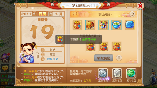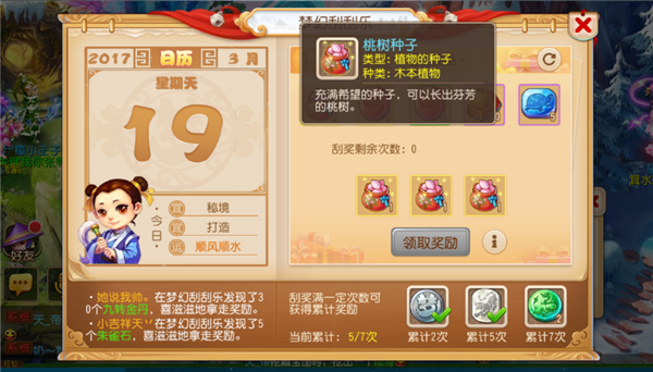 那么,如何才能获得更多的奖励呢?这就需要一些小小的技巧了。在梦幻刮刮乐系统中,玩家可以看到今日的运势,比如:运势平平、时至运来、顺风顺水、吉星高照、鸿运当头等等,而运势越高,越容易刷新出更好的奖励。除此之外,玩家只要保持上线,就可以将梦幻刮刮乐次数保留下来。也就是说,玩家完全可以在累积了一定数量的梦幻刮刮乐之后,选择一个运势比较好的时间集中刮。相信利用这一规则,玩家就能轻松获得强化石、修炼果、九转金丹甚至神兽灵石等高额奖励了!