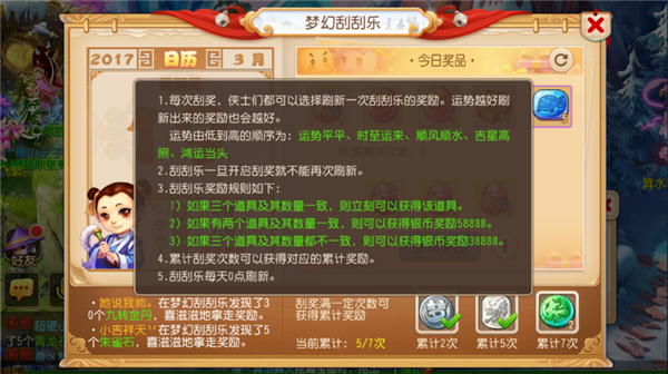 3月15日,《梦幻西游》手游“梦幻刮刮乐”系统震撼出炉!玩家只要点击“福利”界面,即可进入梦幻刮刮乐玩法中,每天刮一张梦幻刮刮乐。在这过程中,如果玩家刮出了三个名称和数量都相同的道具,即可获得对应物品奖励,反之则获得一定银两作为鼓励金。除此之外,玩家刮奖累积满一定次数,更可以获得累积奖励。如果玩家想要试试看自己的手气,那么就来体验一番全新的梦幻刮刮乐吧!