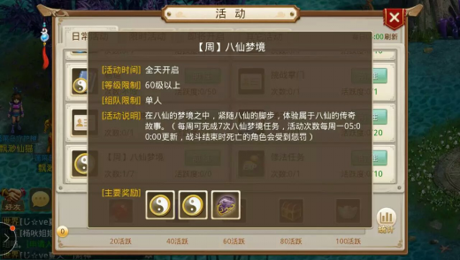点击日常活动中八仙梦境的前往按钮,即可自动寻路至蓬莱岛蓬莱使者处。与其对话后,即可进入八仙梦境。