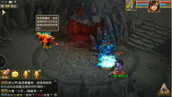 穿山甲速度550左右,气血20W左右,伤害1W左右,几率出现法宝技能混元金斗。1300道无法障碍,一回合内相同攻击只生效一次,最好是人物使用法术、宠物使用物理攻击或者人物物理攻击、宠物使用法术攻击。因穿山甲伤害比较高,建议看好人物血量。