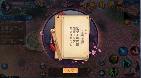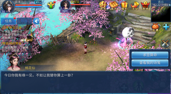 每天桃花仙会随机出现在桃花林,玩家可以前往桃花仙处占卜今日运势