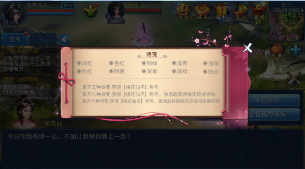 玩家打开机缘丹可以随机获得一种颜色的诗笺奖励,使用诗笺后会有幸运加成。玩家可到桃花仙处查看诗笺,一共有十种诗笺: