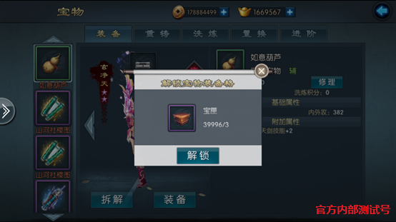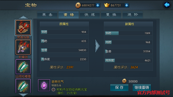 宝物重铸:宝物的基础属性可进行重铸,改变基础属性的数值大小。(重铸消耗造物元气)