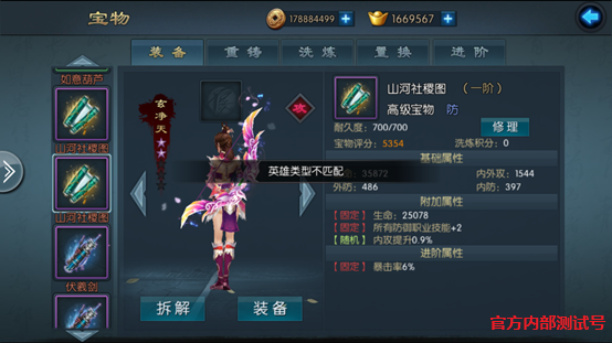 首先每个英雄可装备1个宝物,装备前解锁宝物栏,同时需要注意的是宝物有四种类型分别对应四种职业(攻击/防御/辅助/控制),待装备的宝物必须和侠客战斗定位相匹配,如果不匹配则系统提示无法穿戴。