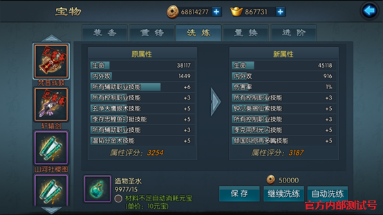 宝物洗练消耗造物圣水,系统自动记录宝物的洗练次数,在宝物分解的时候会根据洗练评分返还部分材料