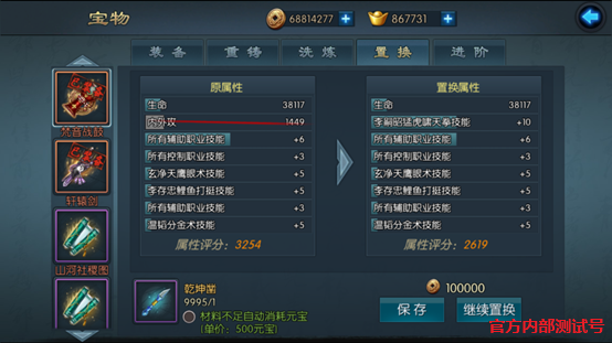 宝物置换,宝物置换可随机替换一条宝物附加属性,包含固定属性和随机属性。(置换消耗阴阳凿)