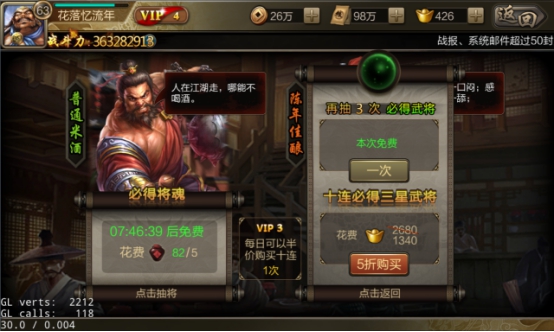 玩家在酒馆中可招募武将,酒馆招募分为米酒宴请与陈酿宴请。米酒宴请需消耗女儿红,有可招募到低中资质的武将。陈酿宴请需消耗元宝,可招募到所有自制的武将。
