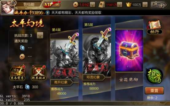 太平幻境每日拥有1次免费重置关卡次数,可将所有关卡重置为未挑战状态,重置之后需从第一层开始挑战,并正常获得挑战奖励。